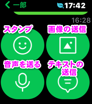 Apple Watchからはスタンプ、画像の送信、音声、テキストの送信が可能です。