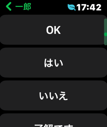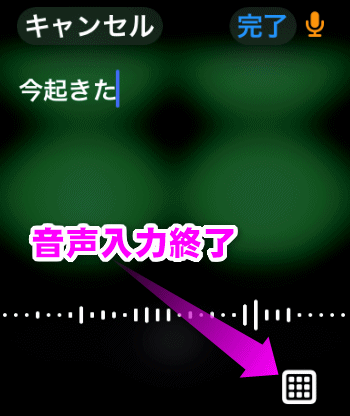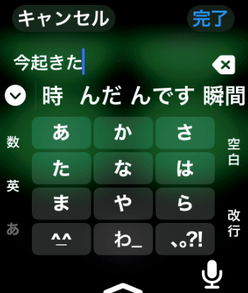 Apple Watchの画面は小さいので、好きな文章を送りたい場合はこのように音声入力の方がおすすめです。
