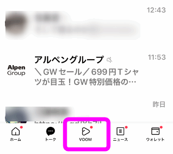 LINEを立ち上げたら、画面下の「VOOM」をタップします。