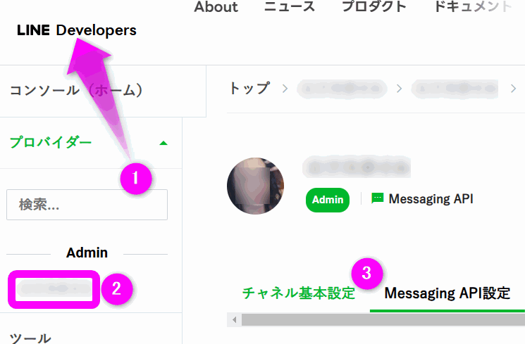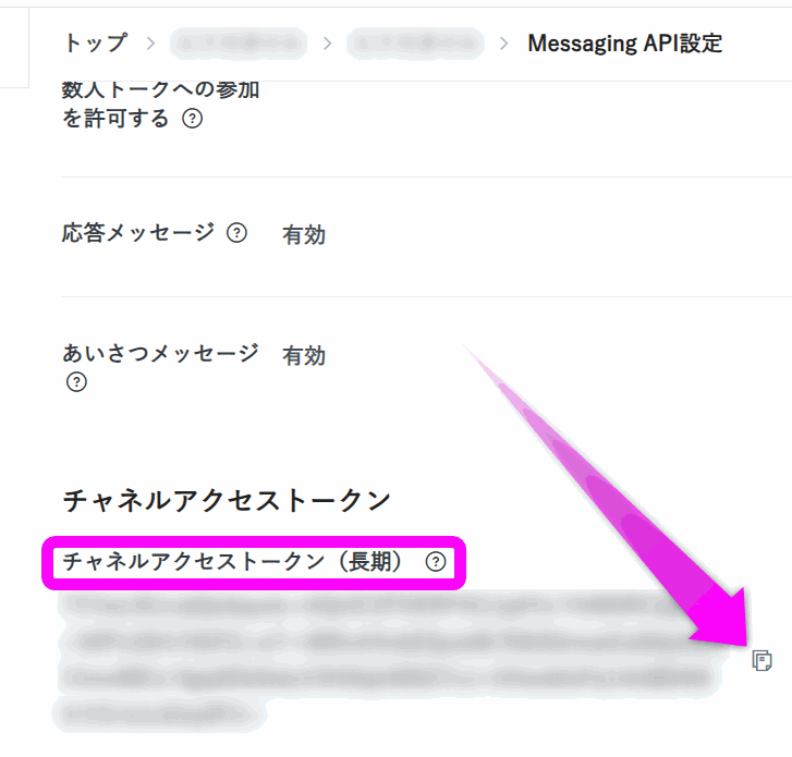 上のソース内の「アクセストークン」は、LINE Developersコンソールのページにある・・・
