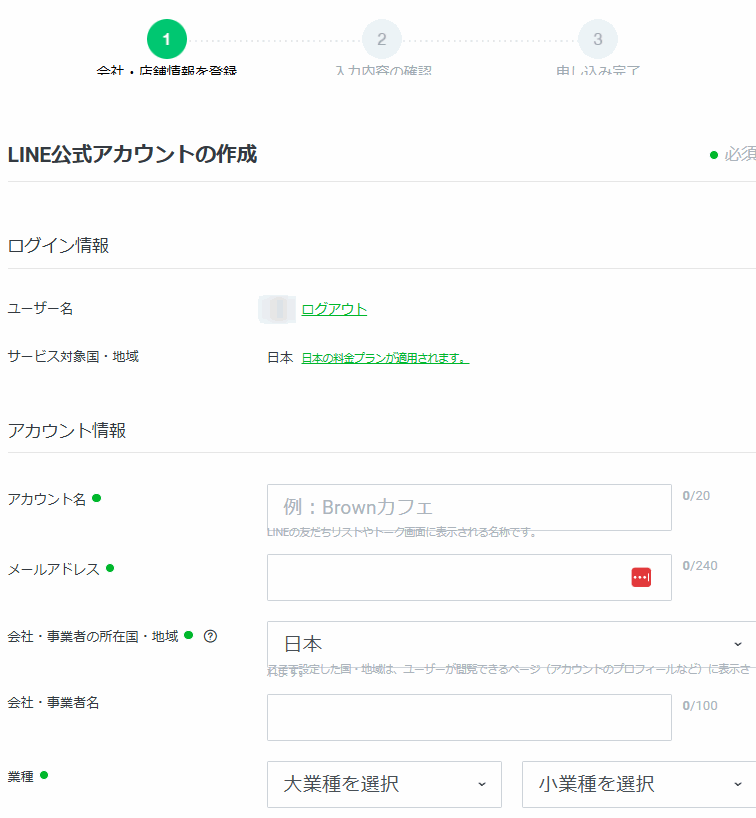 「アカウント名」や「メールアドレス」などを入力していきます。